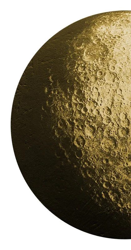 Mixed-media wall hanging exploring the lunar form and atmospheric light through gilded surfaces.