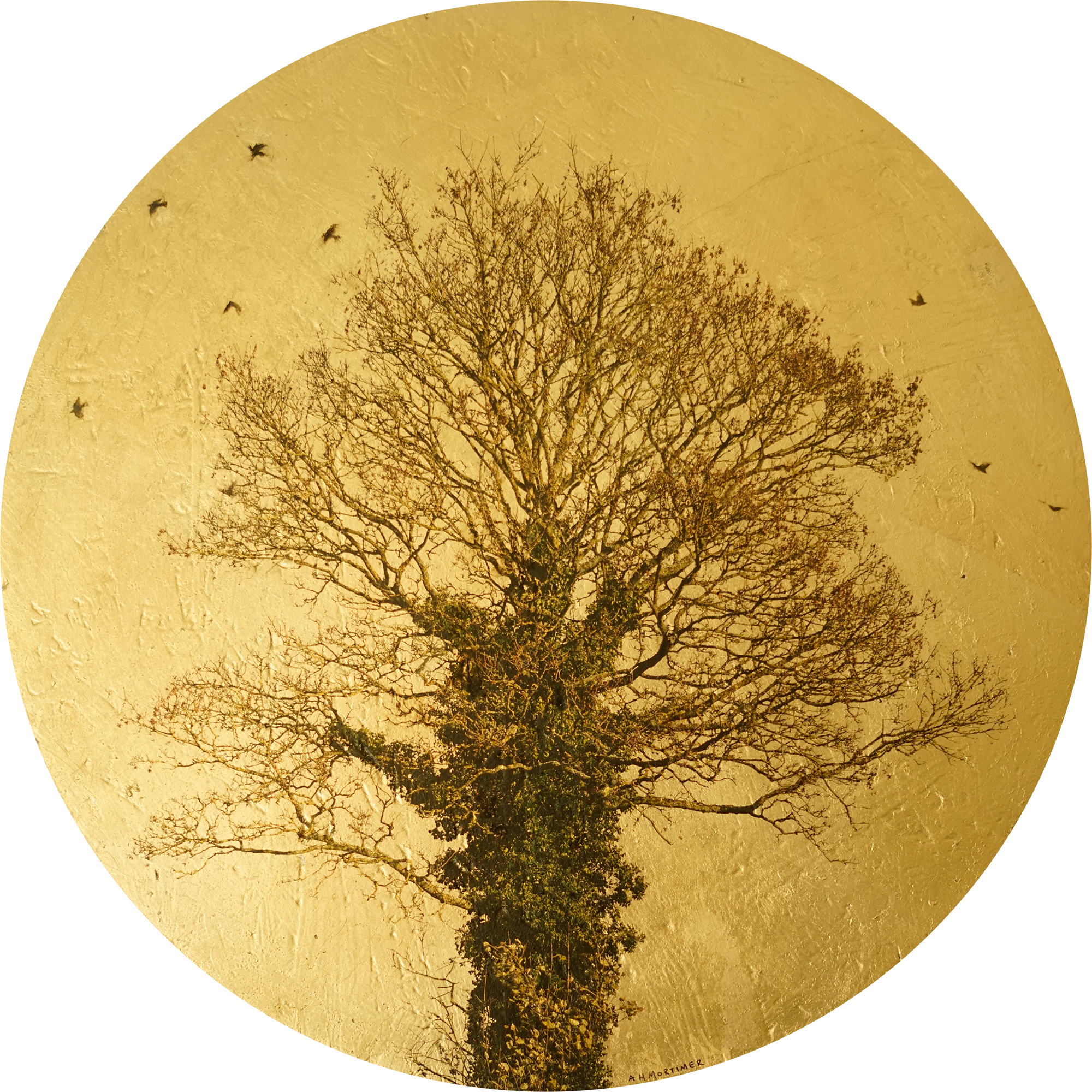 These unique and atmospheric artworks are created through a blend of photography and painting, via the layering of pigment inks, oil or acrylic paint and various glazes layered onto gilded wooden board, aluminium or OSB. Whether gold or silver leaf is employed, reflections subtly change with the differing ambient light through the day; artificial lighting affords a warmth that draws the eye and elevates its surroundings.